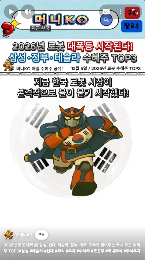 - 국가 전략 사업 지정과 테슬라 옵티머스 상용화라는 흐름 속에서 핵심 부품 기술로 반사이익을 얻는 기업